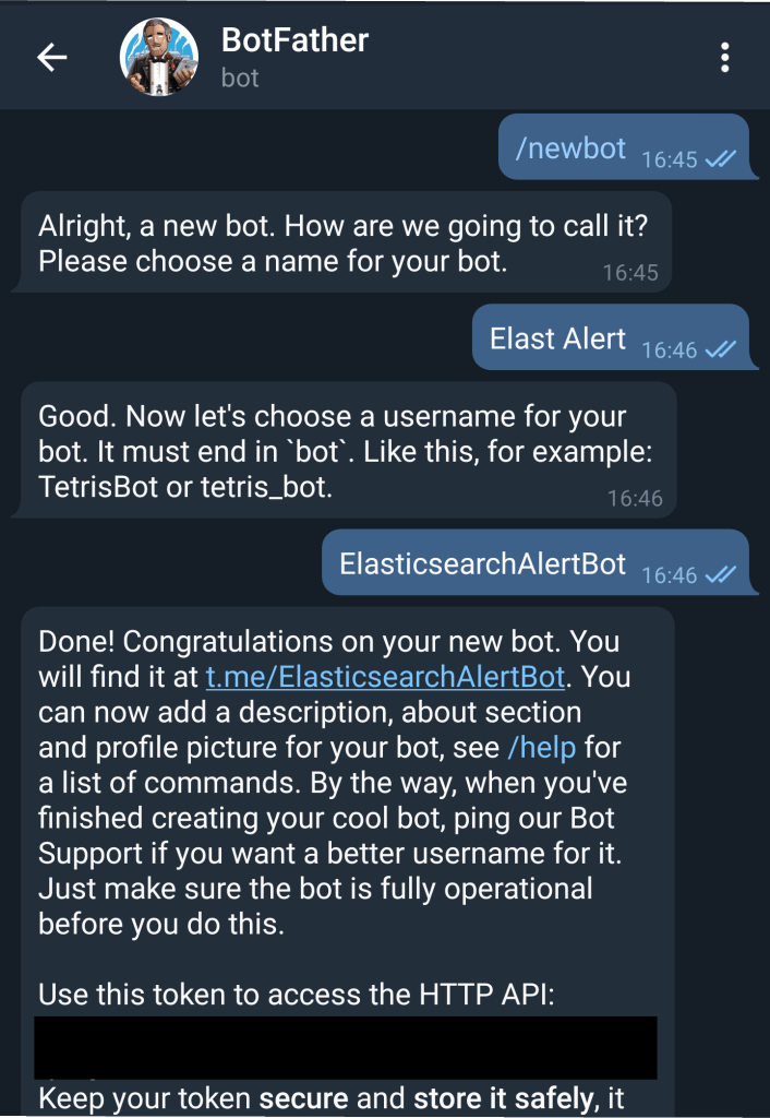 No vamos a entrar en detalle, pero para crear el Bot pueden seguir alguna de las varias guías online para esto, como https://core.telegram.org/bots#creating-a-new-bot o https://blogthinkbig.com/crear-bot-de-telegram-botfather, pero lo que necesitamos lograr son 2 datos: telegram_bot_token y telegram_room_id.