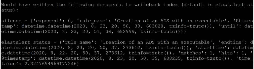 elastalert-test-rule --config /opt/elastalert/config.yaml /opt/elastalert/rules/windows_sysmon_ads_executable.yml
