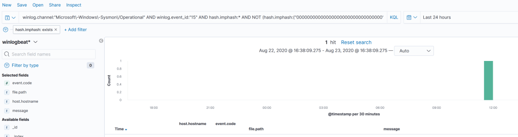 De hecho al revisar los campos que me llegan al Elasticsearch, no aparece el “winlog.event_data.Imphash” sino que ese dato lo tengo en el campo “hash.imphash” o en “file.pe.imphash”.