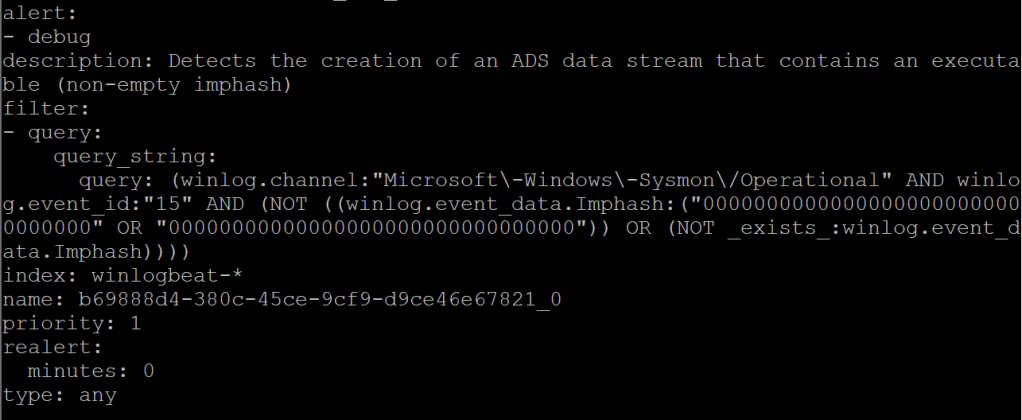 tools/sigmac -c winlogbeat --target elastalert rules/windows/sysmon/sysmon_ads_executable.yml > /opt/elastalert/rules/windows_sysmon_ads_executable.yml