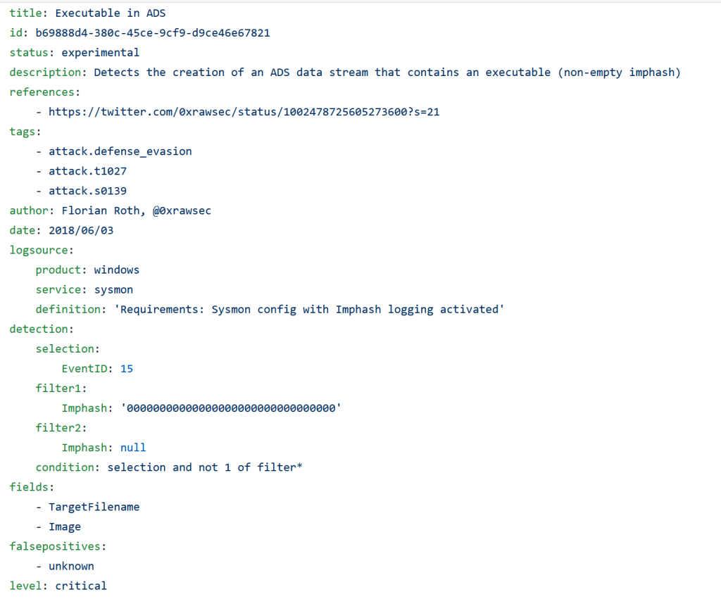 Por ejemplo, si revisamos la regla en sigma/rules/windows/sysmon/sysmon_ads_executable.yml: