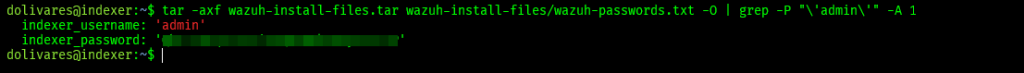 $ tar -axf wazuh-install-files.tar wazuh-install-files/wazuh-passwords.txt -O | grep -P "\'admin\'" -A 1