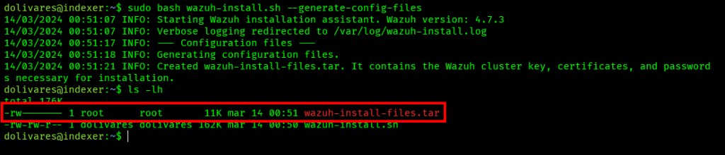 Este generará el archivo wazuh-install-files.tar, conteniendo todos los archivos y configuraciones necesarias para configurar el cluster.