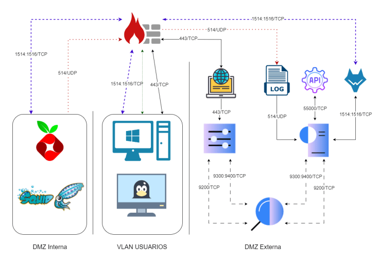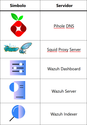 - DMZ Interna: en la DMZ Interna tendremos el servidor PiHole para DNS y el servidor SQUID en modo Proxy Fordward, ambos enviaran sus LOG al servidor Wazuh Server.