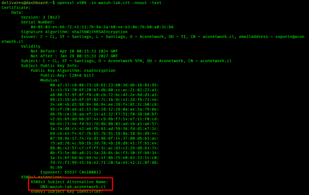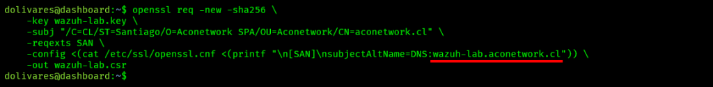 -config <(cat /etc/ssl/openssl.cnf <(printf "\n[SAN]\nsubjectAltName=DNS:wazuh-lab.aconetwork.cl")) \