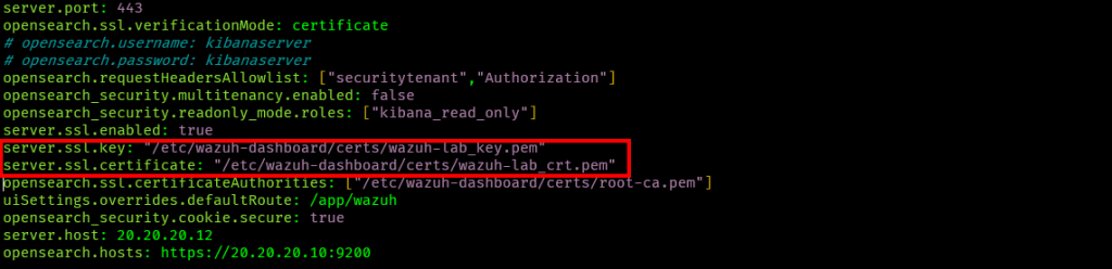 Ahora tendremos que actualizar la configuración del servicio opensearch-dashboard con la ubicación de nuestros certificados. El archivo de configuración se encuentra en la ruta ““”/etc/wazuh-dashboard/opensearch_dashboards.yml”.