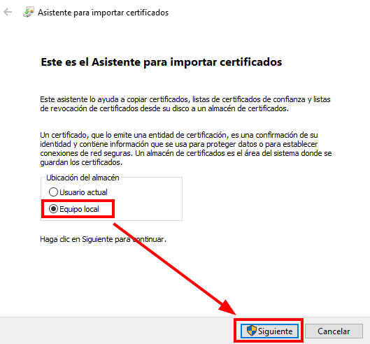 A continuación, deberemos indicar la ubicación del llavero donde se guardará la CA. Para este caso seleccionaremos “Equipo local” y luego “siguiente”.