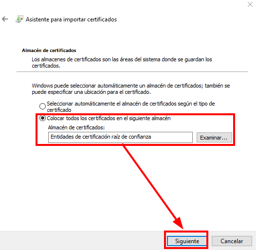 Luego definiremos el almacén donde se guardará la CA. Para esto seleccionamos “Colocar todos los certificados en el siguiente almacén” y seleccionamos “Entidades de certificación raíz de confianza”, continuamos haciendo clic en “Siguiente”.