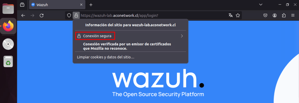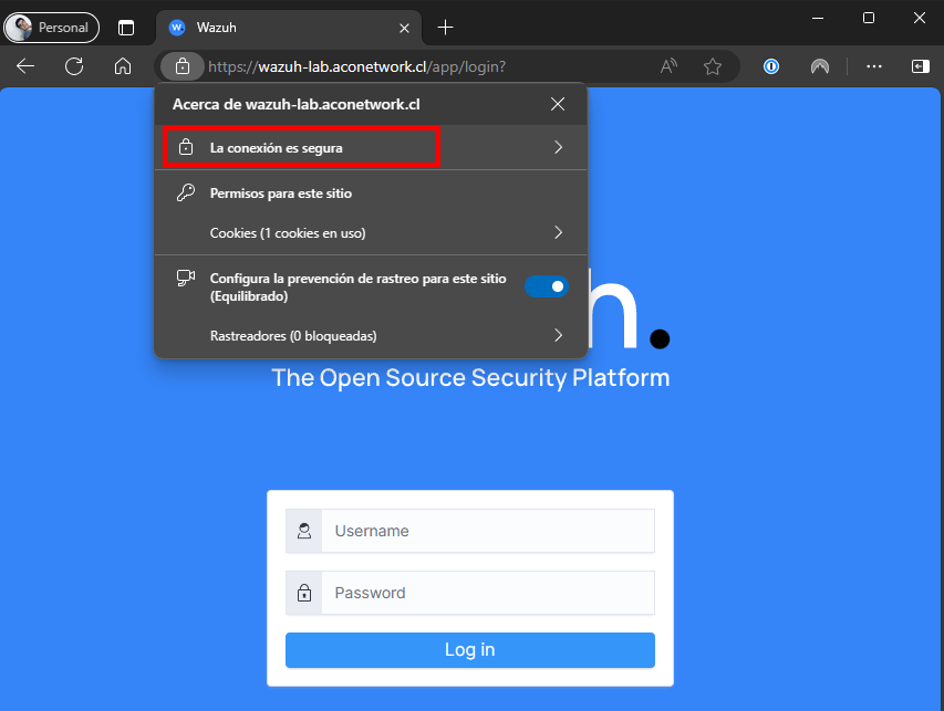 Reiniciamos el navegador y entramos nuevamente al portal de Wazuh. Ahora veremos que la conexión por FQDN tiene un certificado válido.