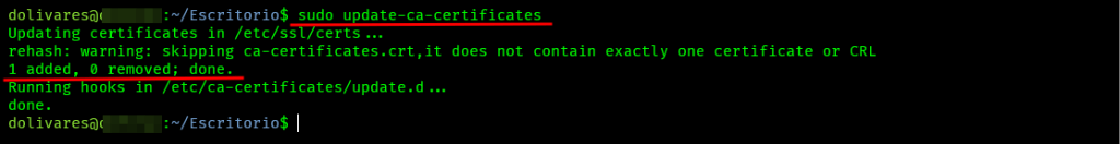 Y finalizaremos actualizando el listado de CA instaladas con el comando “sudo update-ca-certificates”: