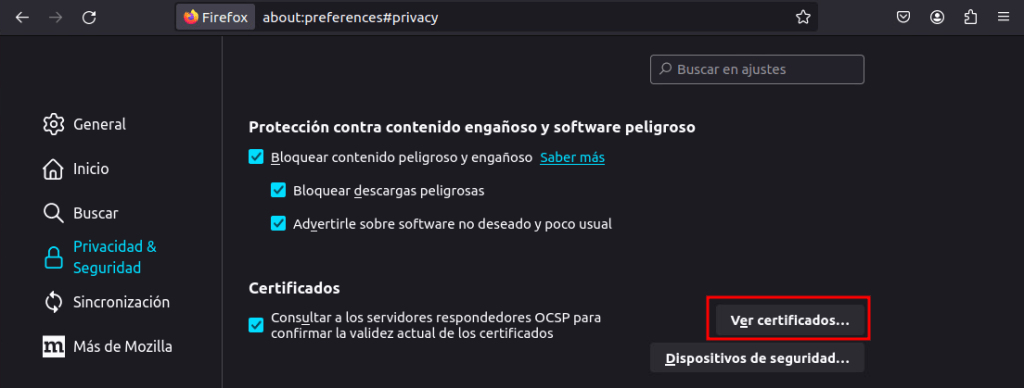 Para poder importar la CA en Firefox y que este reconozca los certificados que se firmen, debemos ir a “Ajustes -> Privacidad y Seguridad -> Certificados” y luego hacer clic en “Ver Certificados”.