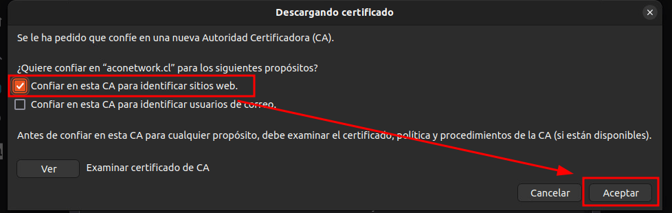 Buscaremos el certificado y lo seleccionaremos para importarlo, cuando hagamos esto, se solicitará que confirmemos los permisos con los que será importada la CA. Debemos hacer clic en “Confiar en esta CA para identificar sitios web” y luego “Aceptar”.