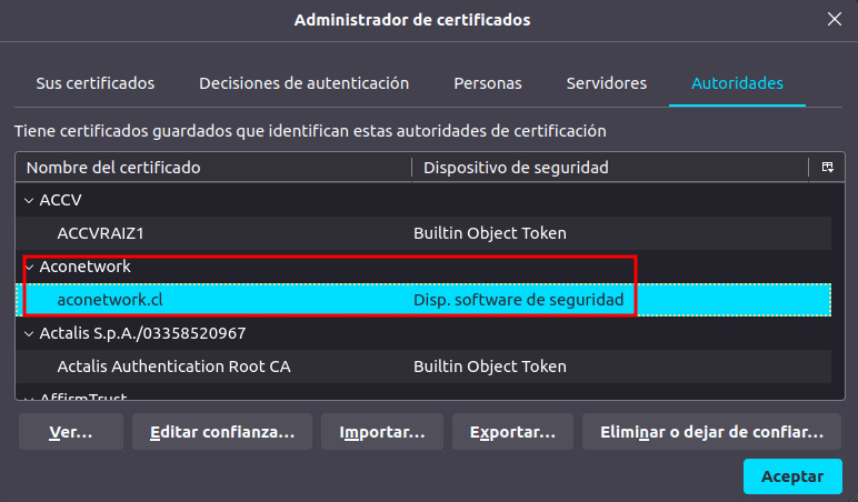 Si todo esto se realizó correctamente deberíamos ser capaces de ver nuestra CA en el listado de Firefox.