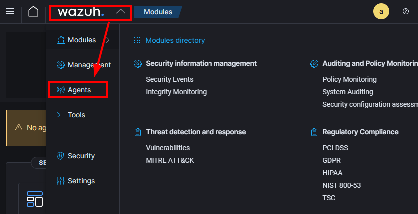 Comenzaremos con la instalación del agente para Linux de Wazuh. Para esto iniciaremos sesión en el portal web de Wazuh y nos dirigiremos a parte superior del sitio y haremos clic en “Wazuh” y luego en “Agents”.