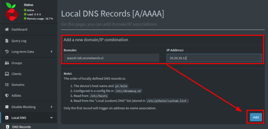 Para realizar la configuración del registro DNS, debemos agregar un registro A en tú servidor DNS. En este caso utilizaremos PiHole como servidor DNS y agregaremos el registro tipo A wazuh-lab.aconetwork.cl apuntando a la IP 20.20.20.12 (Wazuh Dashboard).