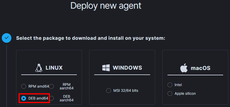En este escenario vamos a instalar el agente en un servidor Ubuntu 22 x64, por lo cual seleccionaremos como paquete de instalación “Linux DEB amd64”