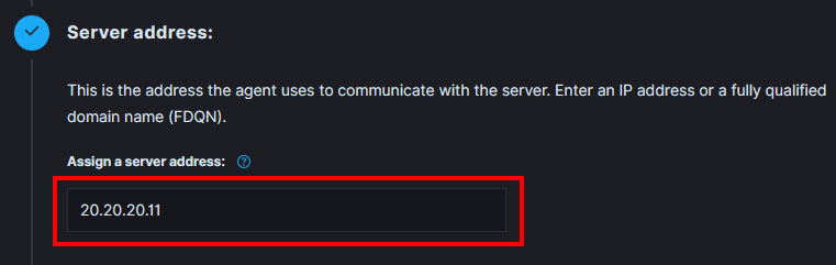 Luego deberemos indicar la dirección del servidor, aquí puedes ingresar una dirección IP o un FQDN. Para este ejemplo indicaremos la IP del servidor con rol “Wazuh Server”: