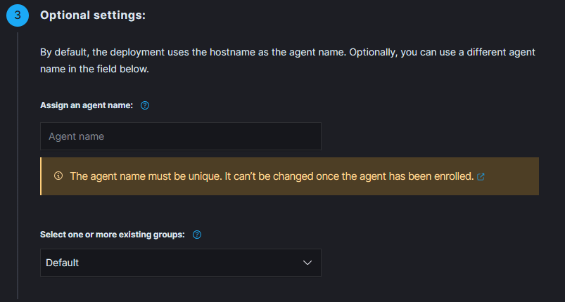 Luego podremos opcionalmente predefinir un HOSTNAME al agente o asignarlo a un grupo. Para este caso ambos quedarán en blanco. Esto significa que el HOSTAME del equipo será el mismo que del Endpoint y el equipo será agregado al grupo “Default”.