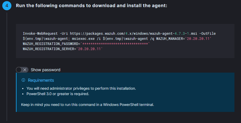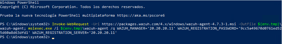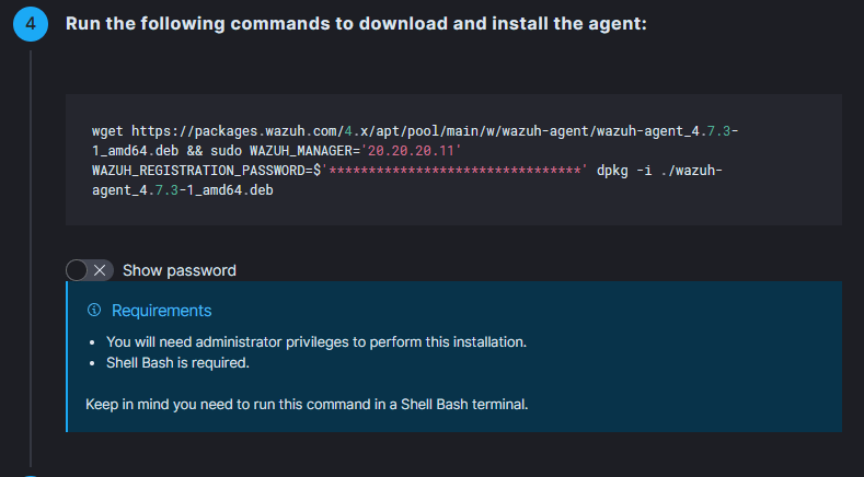 Finalmente, el menú de despliegue nos indicará el comando que debemos ejecutar en el Endpoint para instalar el agente. Si la contraseña de autenticación del agente fue configurada, está aparecerá automáticamente en el comando: