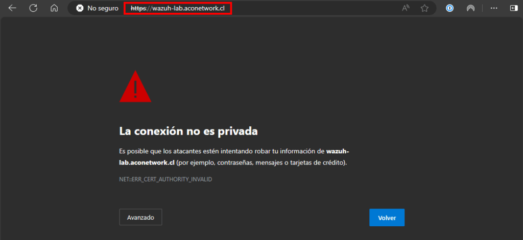 Actualmente tenemos que el ingreso al Dashboard de Wazuh se realiza utilizando la IP del servidor en la URL de acceso, sumado al hecho de que el certificado SSL es autofirmado y no válido para los navegadores. Estas son dos situaciones que buscamos evitar y que son fácilmente solucionables con los equipos que contamos.