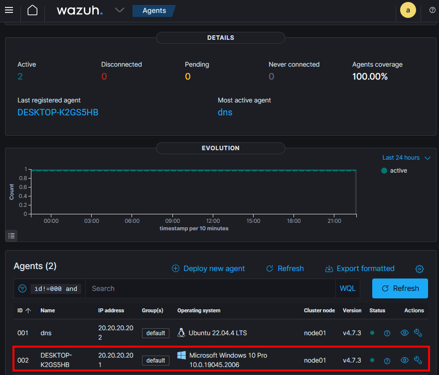 Con esto habremos terminado la configuración inicial del cluster Wazuh y tendremos equipos enviando eventos a nuestro servidor.