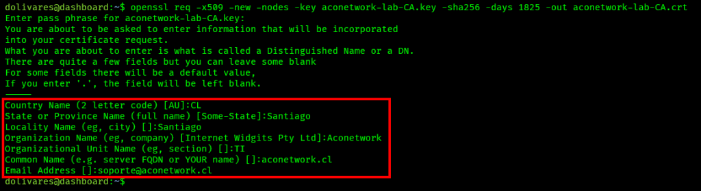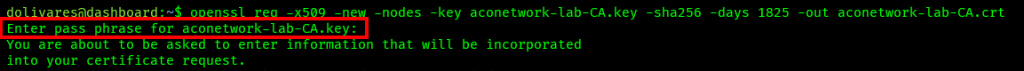 openssl req -x509 -new -nodes -key aconetwork-lab-CA.key -sha256 -days 1825 -out aconetwork-lab-CA.crt