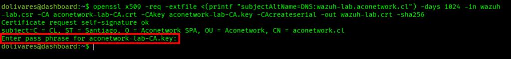 openssl x509 -req -extfile <(printf "subjectAltName=DNS:wazuh-lab.aconetwork.cl") -days 1024 -in wazuh-lab.csr -CA aconetwork-lab-CA.crt -CAkey aconetwork-lab-CA.key -CAcreateserial -out wazuh-lab.crt -sha256