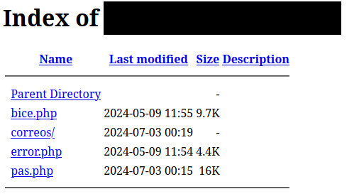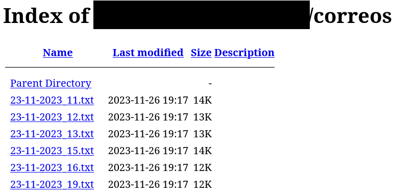 Aquí nos llama la atención que exista una carpeta llamada “correos”, y al ingresar podemos ver que tiene un listado de archivos con los correos de las potenciales víctimas del phishing: