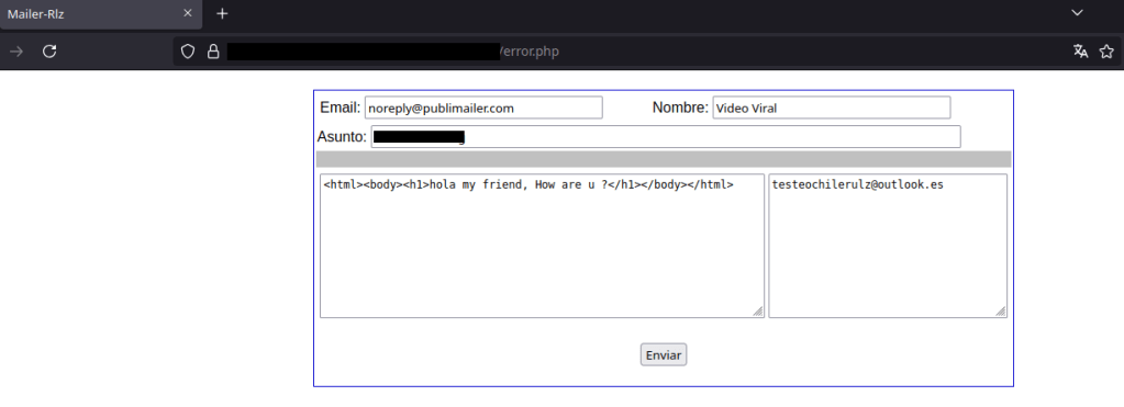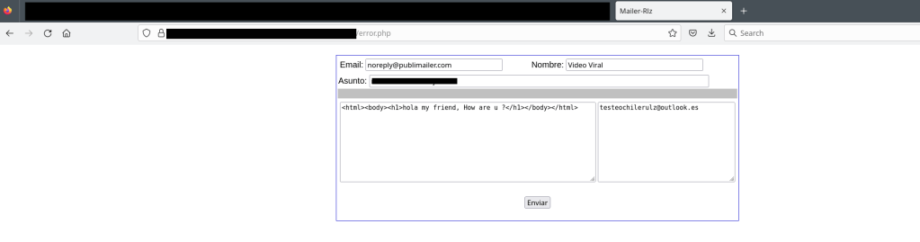 Podemos ver qué hace ese script simplemente revisando la ruta en un navegador y, tenemos una sorpresa, es un “mailer” conocido:
