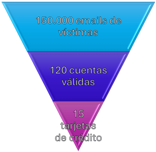 No sabemos exactamente si todos los correos existen, pero es parte interesante de lo que nos faltaba en la investigación anterior, usan una lista de más de 150.000 correos para lograr obtener esas 120 cuentas y 15 tarjetas de crédito que se mencionaron en dicho artículo.