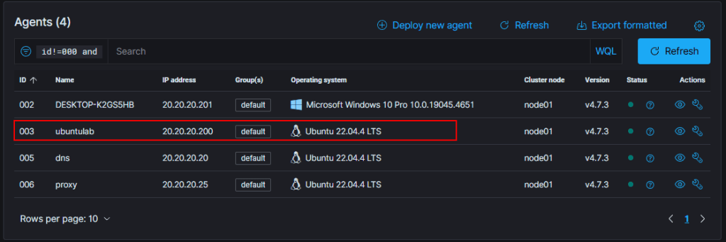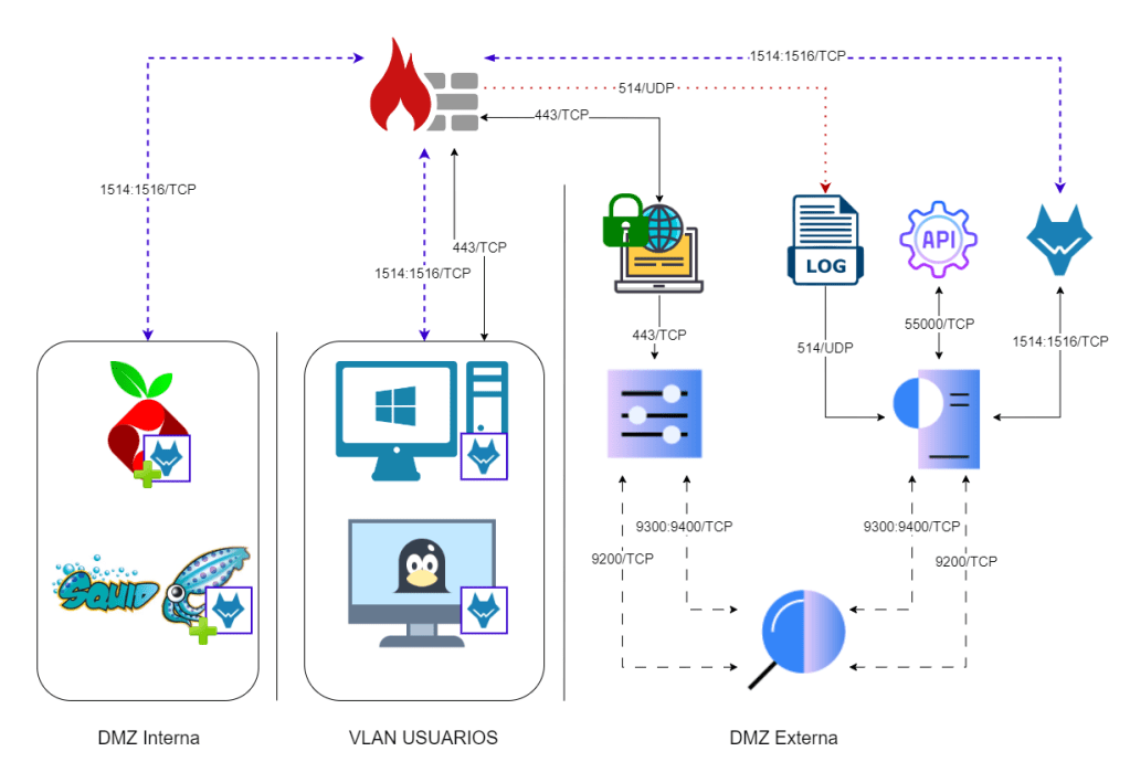 - Servidores (DNS y PROXY) con agente Wazuh instalado y enviando logs de auditoría.