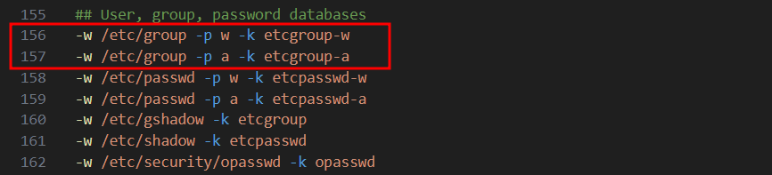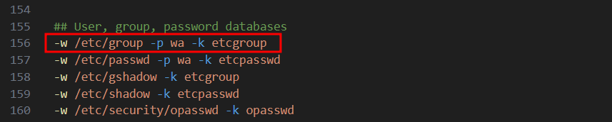 Por ejemplo, en la sección de Usuarios y grupos se define que se monitorearán los “atributos y el acceso” (WA) de la ruta “/etc/group” con llave “etcgroup”.