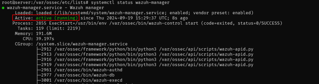 Luego reiniciamos el servicio “wazuh-manager” ejecutando el siguiente comando: