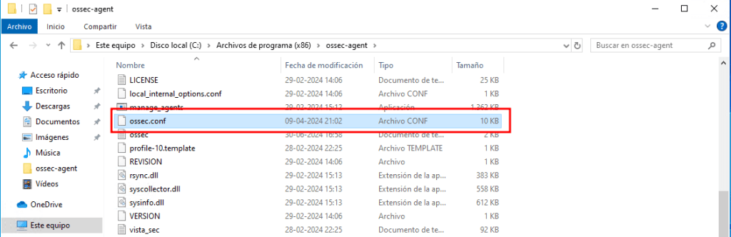 Para esto, tendremos que modificar la configuración del agente. El archivo de configuración se encuentra en ruta “C:\Program Files (x86)\ossec-agent\ossec.conf”