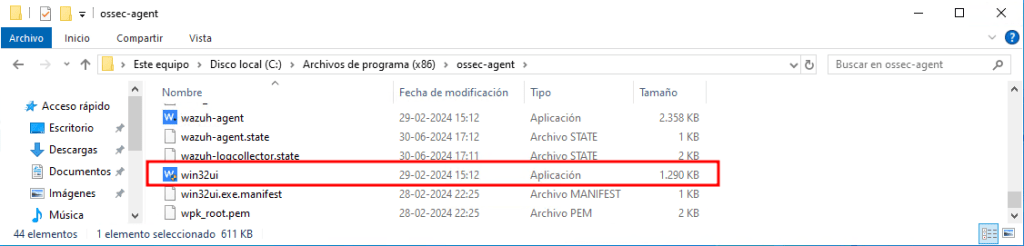 Guardamos el archivo y lo cerramos, luego tendremos que reiniciar el agente. Para esto, abriremos el ejecutable “win32ui.exe” el cual corresponde a la interfaz gráfica del mismo. Si no lo encuentran fácilmente, está en la siguiente ruta: “C:\Archivos de Programa (x86)\ossec-agent\”.