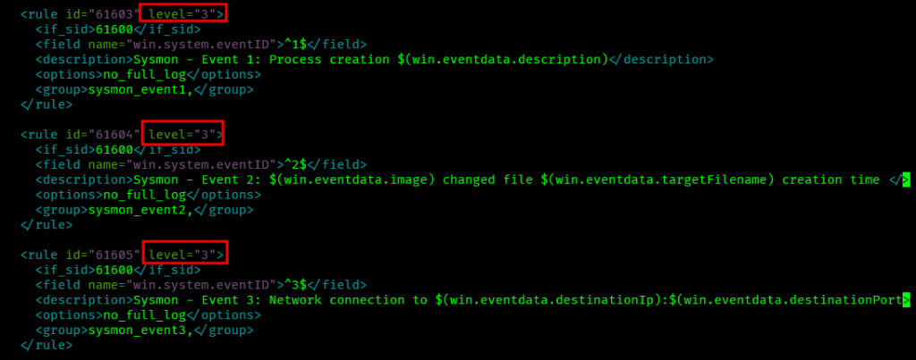 Como ejemplo y para tener una idea de cómo se ve la información que comenzamos a enviar, modificaremos el archivo “0595-win -sysmon_rules.xml” que se encuentra en ruta “/var/ossec/ruleset/rules/“ del servidor Wazuh (20.20.20.11).