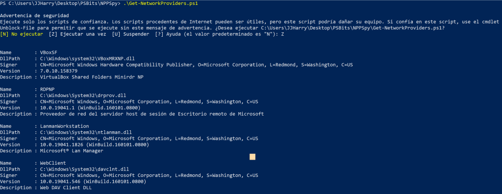 En la imagen que sigue, se observa en la consola de powershell la ejecución del script Get-NetworkProviders.ps1 que entrega los detalles de los proveedores de red existentes en el sistema. Por defecto, en la máquina de pruebas con el sistema operativo Windows 10 vienen incorporado los proveedores LanmanWorkstation, RDPNP, Webclient y VboxSF (incorporado junto con VirtualBox).