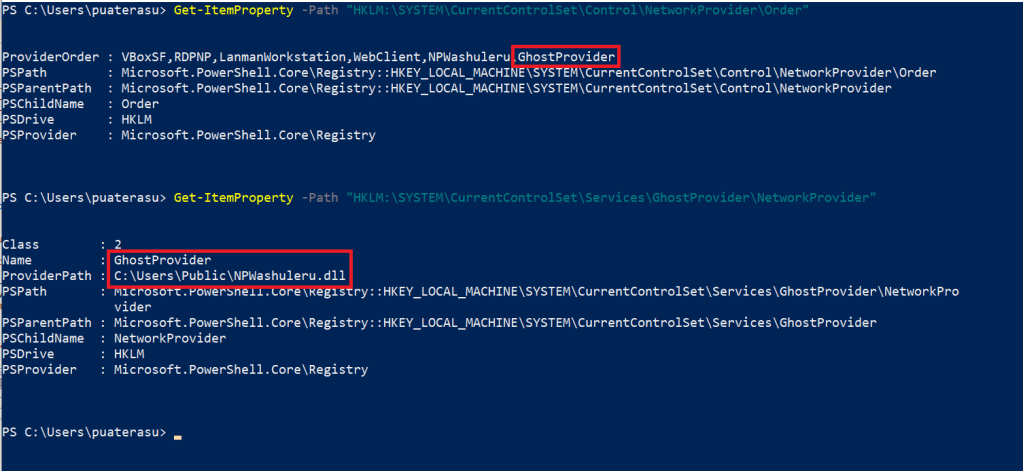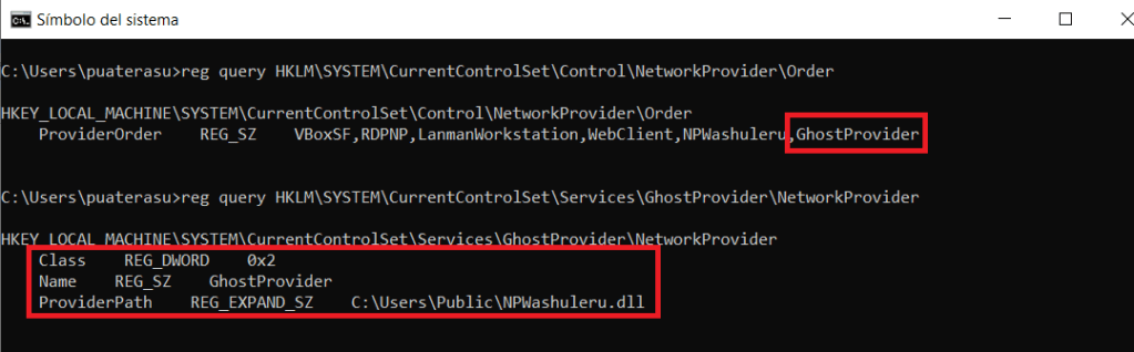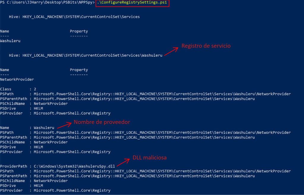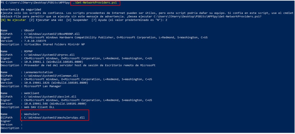 Se vuelve a ejecutar el primer script para verificar el registro del nuevo proveedor. Como se ve en la siguiente imagen, el proveedor de red Washuleru se encuentra en el registro, asignado con el archivo WashuleruSpy.dll en el directorio raíz.
