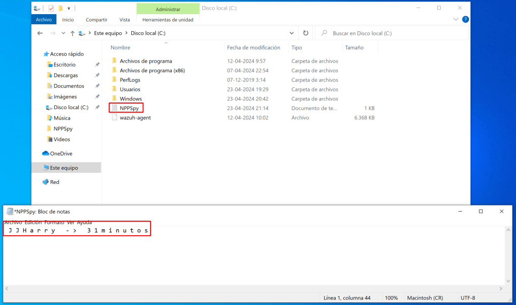 Al iniciar sesión, nos dirigiremos al directorio raíz C:\ donde fue generado el archivo de texto “NPPSpy.txt”. Podemos observar en la imagen siguiente que las credenciales utilizadas para entrar a la máquina han sido almacenadas en texto plano sin cifrar la información.