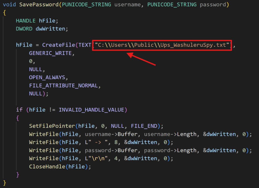 La función SavePassword() viene con los parámetros username y password, que pasan a poseer información una vez que NPLogonNotify realiza el barrido de su código y obtener las credenciales del inicio de sesión. Luego, con la función CreateFile, perteneciente a la API de Windows, permite crear un archivo.