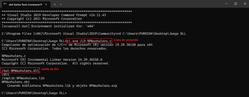 Ocupando el servicio x64 Native Tools Command Prompt for VS 2019 (disponible con la descarga de Visual Studio), ubicamos el directorio que aloja el código (NPWashuleru.c) y ejecutamos la línea de comando:
