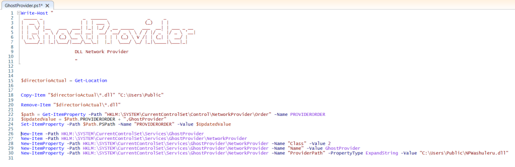 El script ConfigureRegistrySettings.ps1 permite añadir el nuevo proveedor de red como servicio al registro de Windows. Para este caso, el nuevo proveedor de red será Washuleru.