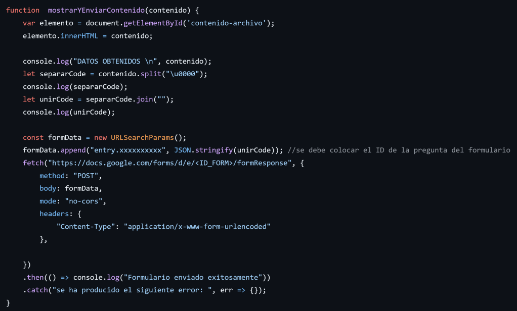 Adicionalmente, fue desarrollado un script HTML anidado con código JavaScript, para recibir un archivo de texto desde el navegador. Este utiliza la API de Google Forms para configurar la entrega del archivo de texto con las credenciales mediante un formulario, proporcionando el ID del campo como la pregunta y la información del archivo como respuesta.