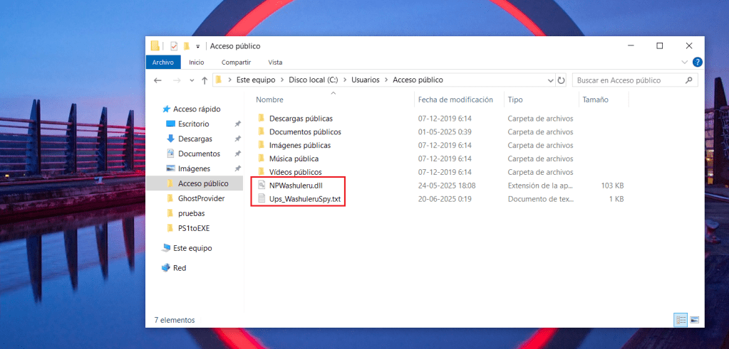Al ejecutar el script de Powershell, la DLL se transfiere al directorio público C:\Users\Public. Se observa que, al colocar la DLL en el sistema, el AV no lo detecta como malicioso.