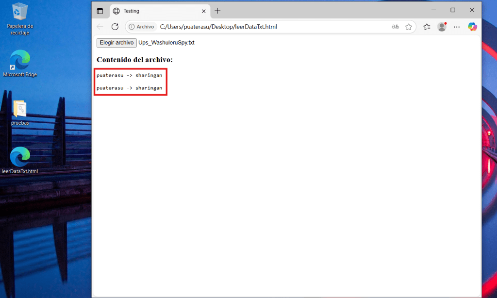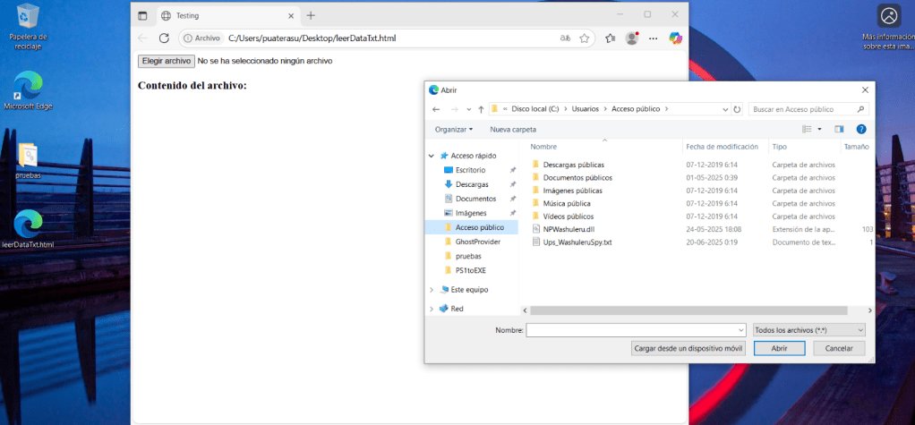 Con el ataque realizado, se exfiltra la información con el archivo leerDataTxt.html. Se examina desde el navegador para elegir el archivo de texto.