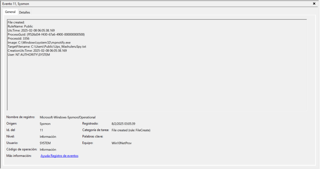 Al observar el registro de eventos de Sysmon, se encuentra solo el evento 11, el cual indica que se ha creado el archivo Ups_WashuleruSpu.txt (FileCreate) por el servicio mpnotify.exe a nivel de SYSTEM.