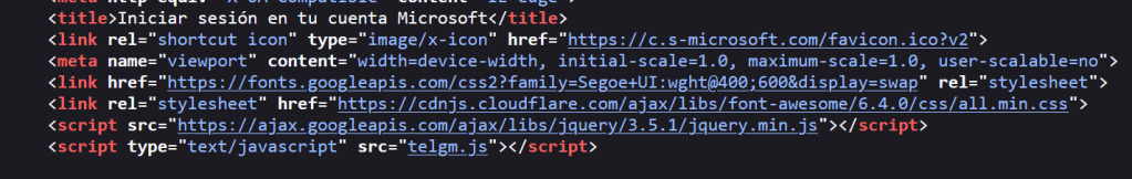 <html><title>...http://[nombre%20corto.js]....<form>... Formulario con campos que se muestran</form>...<script>... Función de cancelar comportamiento normal de formulario, validar la IP de la víctima y enviar la información colectada a telegram definido en archivo [nombre corto.js]</script>...