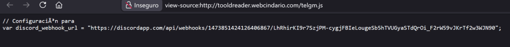 Tenemos finalmente que este archivo de “Telegram” tiene solo una línea de código en donde se define la URL del webhook de Discord.